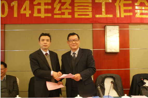 2014年年度經(jīng)營(yíng)工作會(huì)議上,公司董事長(zhǎng)劉年紅先生與公司董事、工程配套分公司經(jīng)理符韌先生簽訂2015年目標(biāo)責(zé)任書