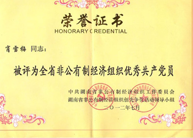 2012年7月3日,在湖南省非公有制企業(yè)黨的建設(shè)工作暨創(chuàng)先爭(zhēng)優(yōu)活動(dòng)表彰會(huì)上,董事會(huì)秘書、工會(huì)主席、董事會(huì)辦公室主任肖雪梅同志榮獲“湖南省非工有制經(jīng)濟(jì)組織優(yōu)秀共產(chǎn)黨員”的關(guān)榮稱號(hào)。